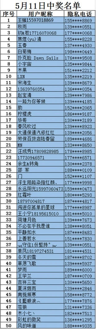 接下来就是最激动的时刻了,以下是获得2020年 5月11日健康万步行走公益活动奖品的50名运动达人!