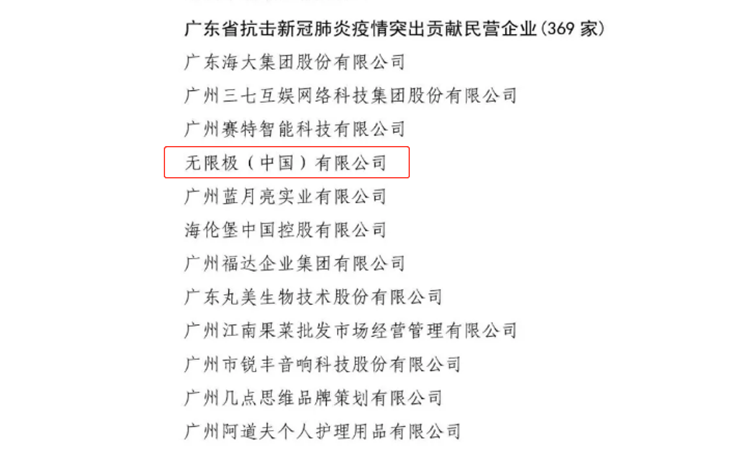 近日,经层层推荐、严格评审,广东省工商业联合会发布了《关于表扬广东省抗击新冠肺炎疫情先进工商联、优秀民营企业、商协会和律师服务团成员的通报》,其中,无限极(中国)有限公司被评为“广东省抗击新冠疫情突出贡献民营企业”。同时获得表彰的还有腾讯、美的、恒大、网易等企业。