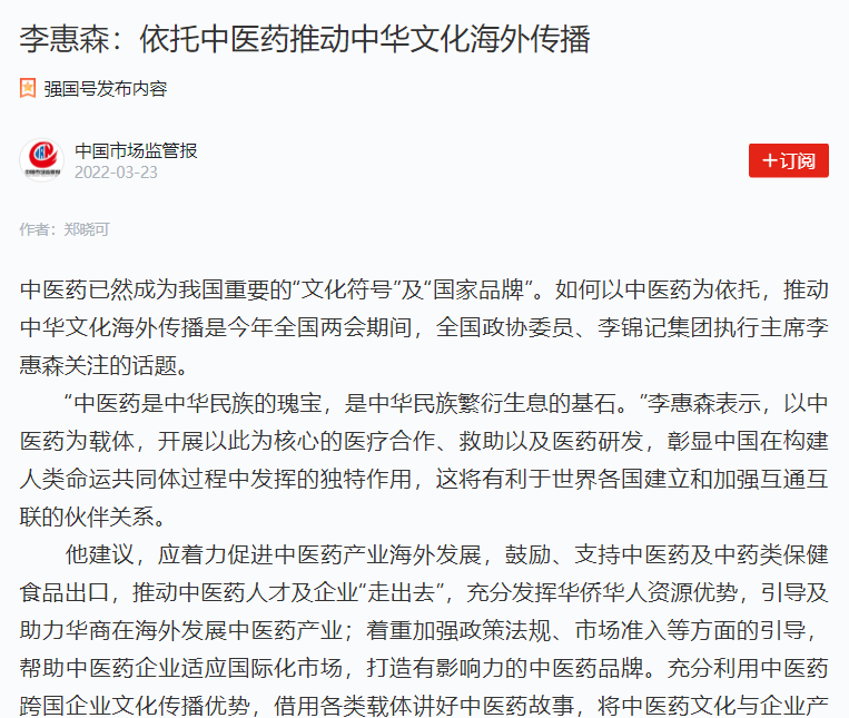 为此,李惠森提交了《关干以中医药为依托推动中华文化海外传播的建议》的提案,建议着力促进中医药产业海外发展、鼓励、支持中医药及中药类保健食品出口,推动中医药人才及企业“走出去”,充分发挥华侨华人资源优势,引导及助力华商在海外发展中药产业:着重加强政策法规、市场准入等方面的辅导,帮助中医药企业适应国际化市场,打造有影响力的中医药品牌。同时充分利用中医药跨国企业的文化传播优势,借用各类载体讲好中医药故事,将中医药文化与企业产品相结合,提高国外民众的中医药产品认同,并通过尊重多元文化积极探索中医药文化与各国本土文化融合方式,增进中医药文化的民心认同。