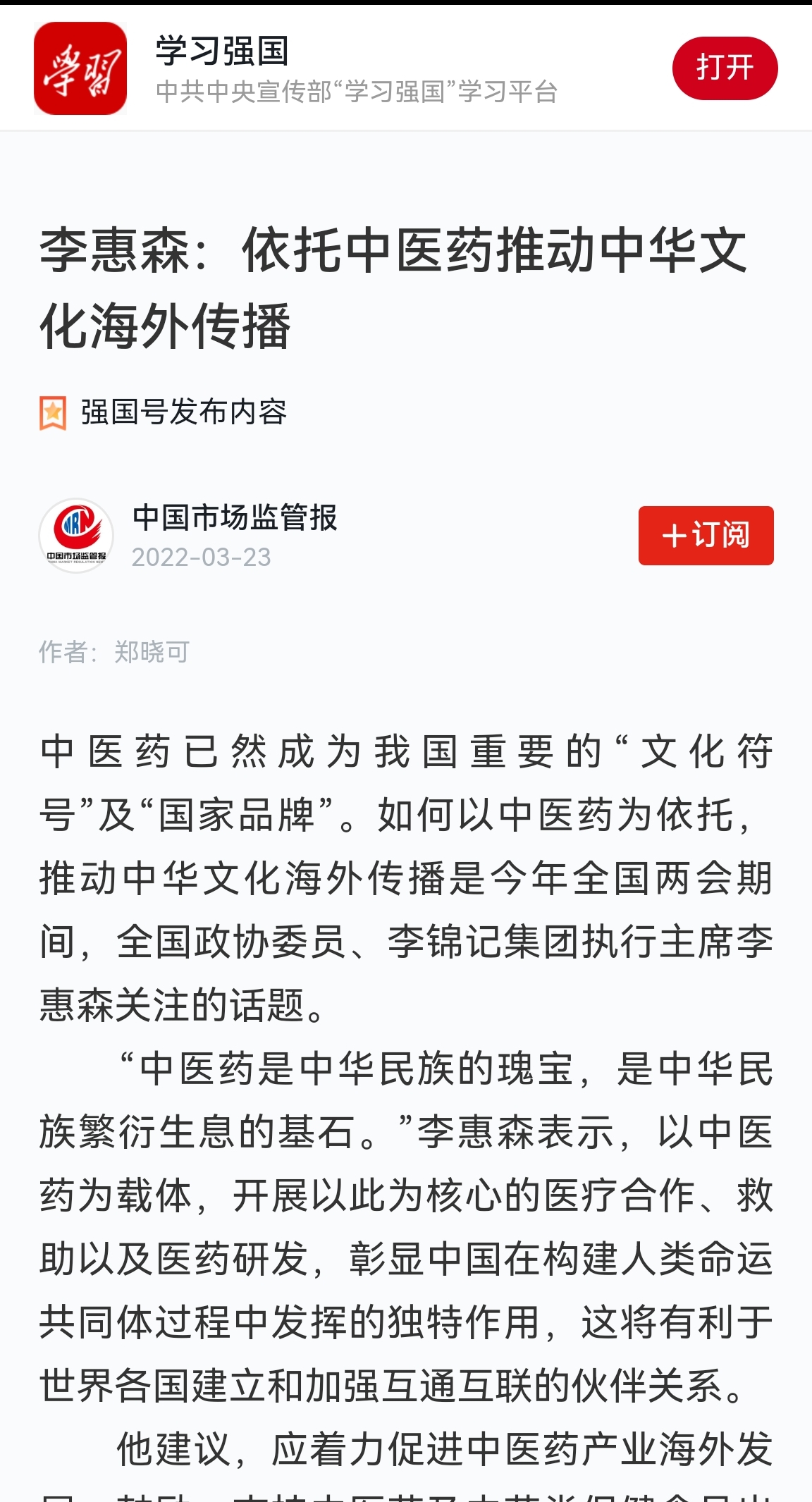 全国政协委员、李锦记集团执行主席李惠森认为,随着中医药医疗价值及中医药文化越来越受到世界各国的认可,依托中医药扩大中华文化海外传播符合时代发展的趋势,正当其时。