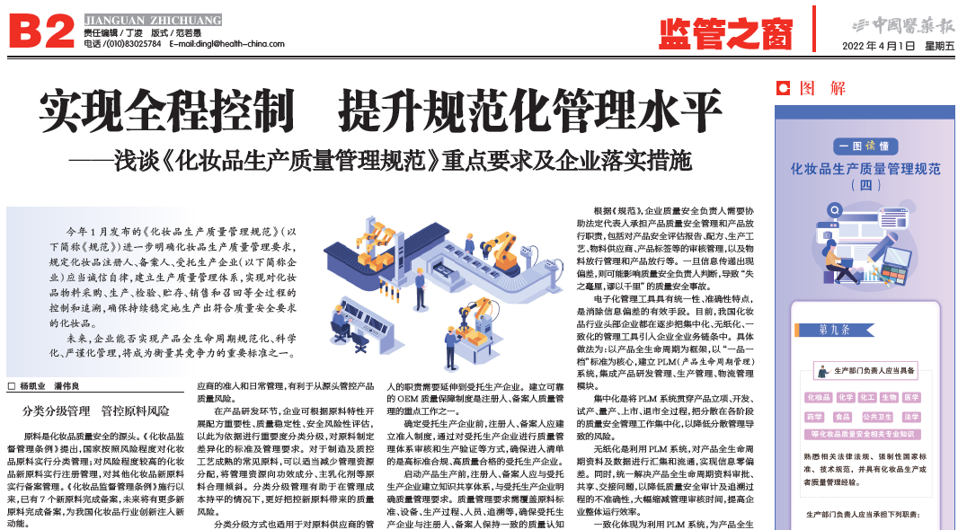 近日,无限极再次受《中国医药报》的邀请发表专栏文章,向化妆品企业分享自身优秀经验,助力政策更好地落地,进一步提升我国化妆品生产质量管理的整体水平。(点击文末链接可以查看《实现全程控制 提升规范化管理水平》原文)