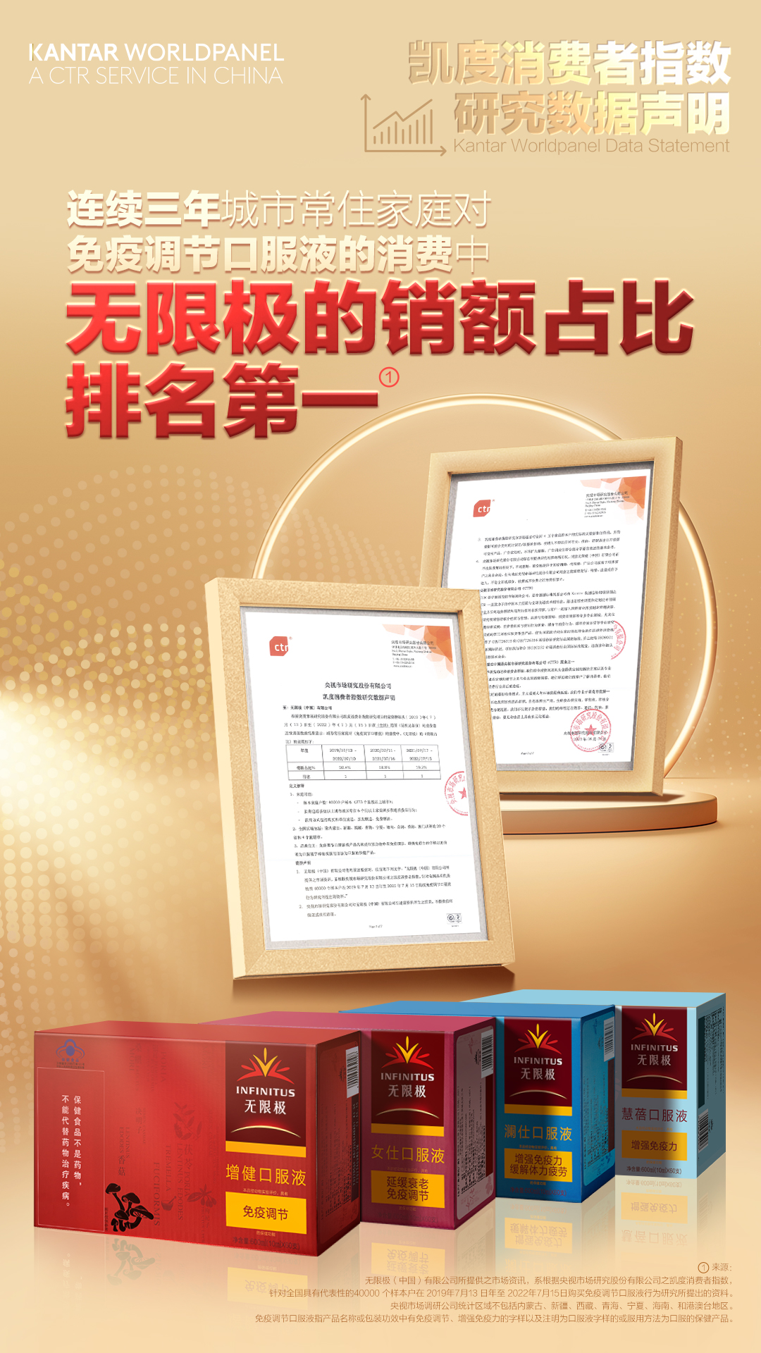 无限极(中国)有限公司所提供之市场资讯,系根据央视市场研究股份有限公司之凯度消费者指数,针对全国具有代表性的40000个样本户在2019年7月13日至2022年7月15日购买免疫调节口服液行为研究所提出的资料。