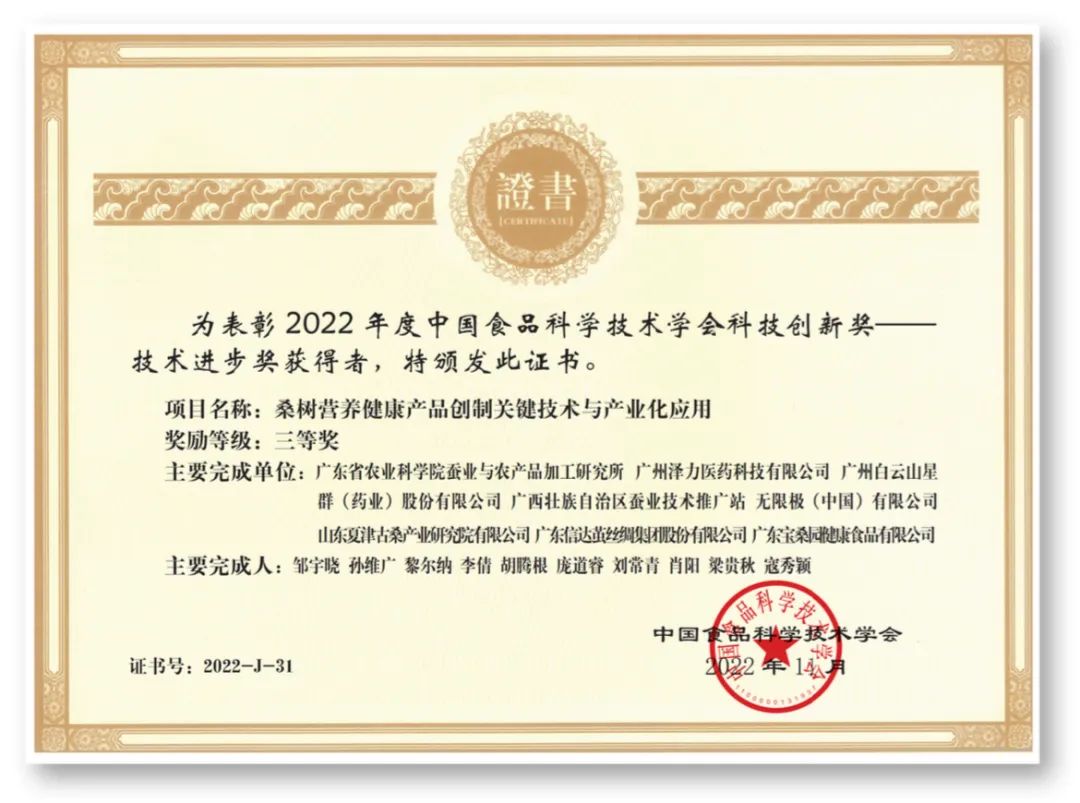 与该产品关联的研究项目“桑树营养健康产品创制关键技术与产业化应用”就在前不久获得了“2022年度中国食品科学技术学会科技创新奖技术进步奖三等奖”。该项目由无限极(中国)有限公司联合广东省农业科学院蚕业与农产品加工研究所等单位共同申报,针对桑树资源营养健康效应物质基础及作用机制不明、高效加工利用技术及配套装备缺乏等问题,以挖掘桑树资源营养健康价值为切入点,围绕原料活性成分与功效评价、精深加工技术与配套装备等方面开展系统研究,取得多项创新成果。