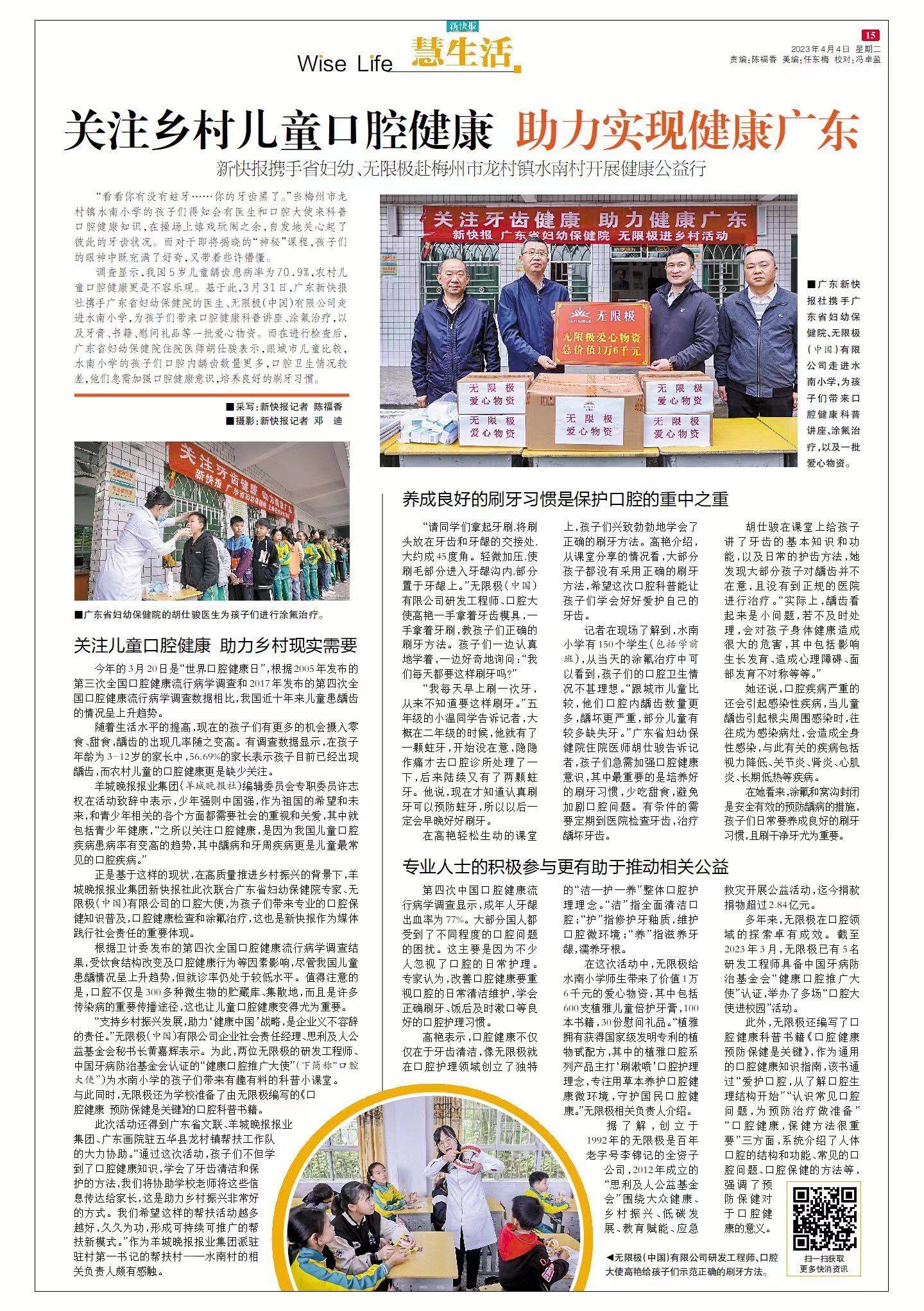 正是基于这样的现状,在高质量推进乡村振兴的背景下,羊城晚报报业集团新快报社此次联合广东省妇幼保健院专家、无限极(中国)有限公司的口腔大使,为孩子们带来专业的口腔保健知识普及,口腔健康检查和涂氟治疗,这也是新快报作为媒体践行社会责任的重要体现。