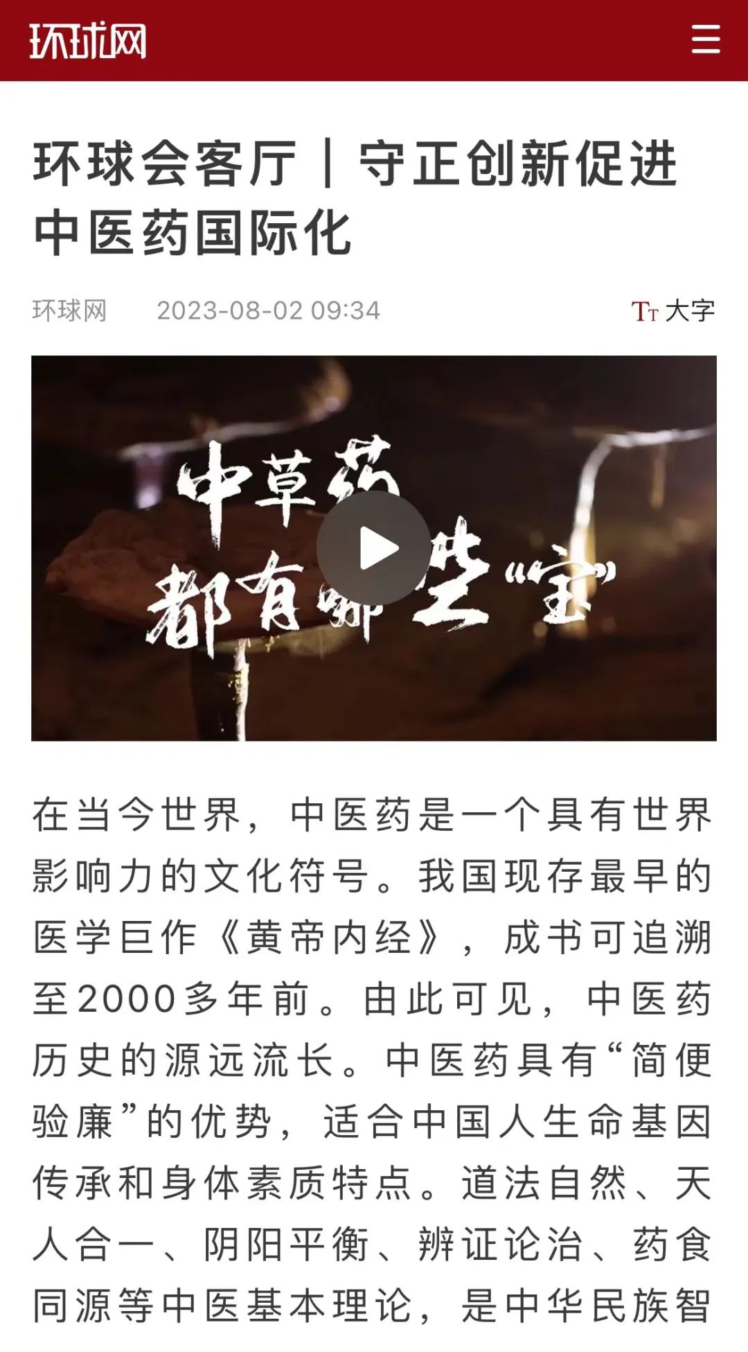 “传承精华,守正创新”是不断推进中医药高质量发展的关键所在。没有传承,创新就失去根基;没有创新,传承就失去未来。为此,环球网《环球会客厅》邀请到无限极研发总监唐青涛以及中山大学教授杨得坡,就中医药的传承与发展进行了探讨。