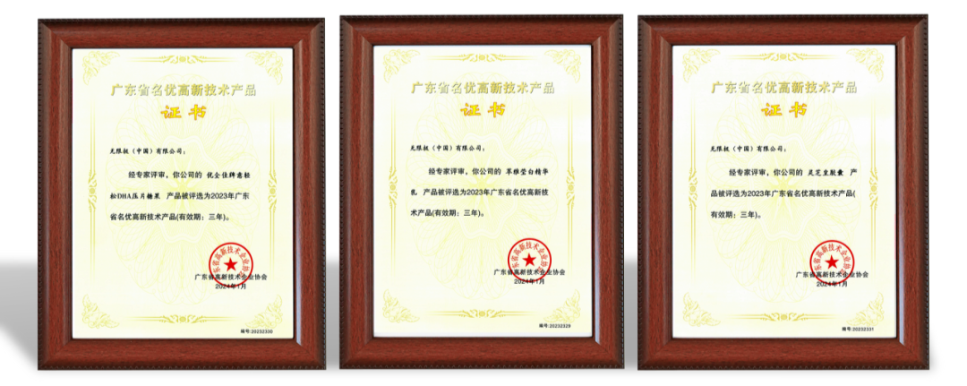 近日,广东省高新技术企业协会颁发了2023年广东省名优高新技术产品证书,无限极(中国)有限公司旗下三款产品——养固健灵芝皇胶囊、萃雅莹白精华乳、优全佳牌意轻松DHA压片糖果荣获“2023年广东省名优高新技术产品”称号。