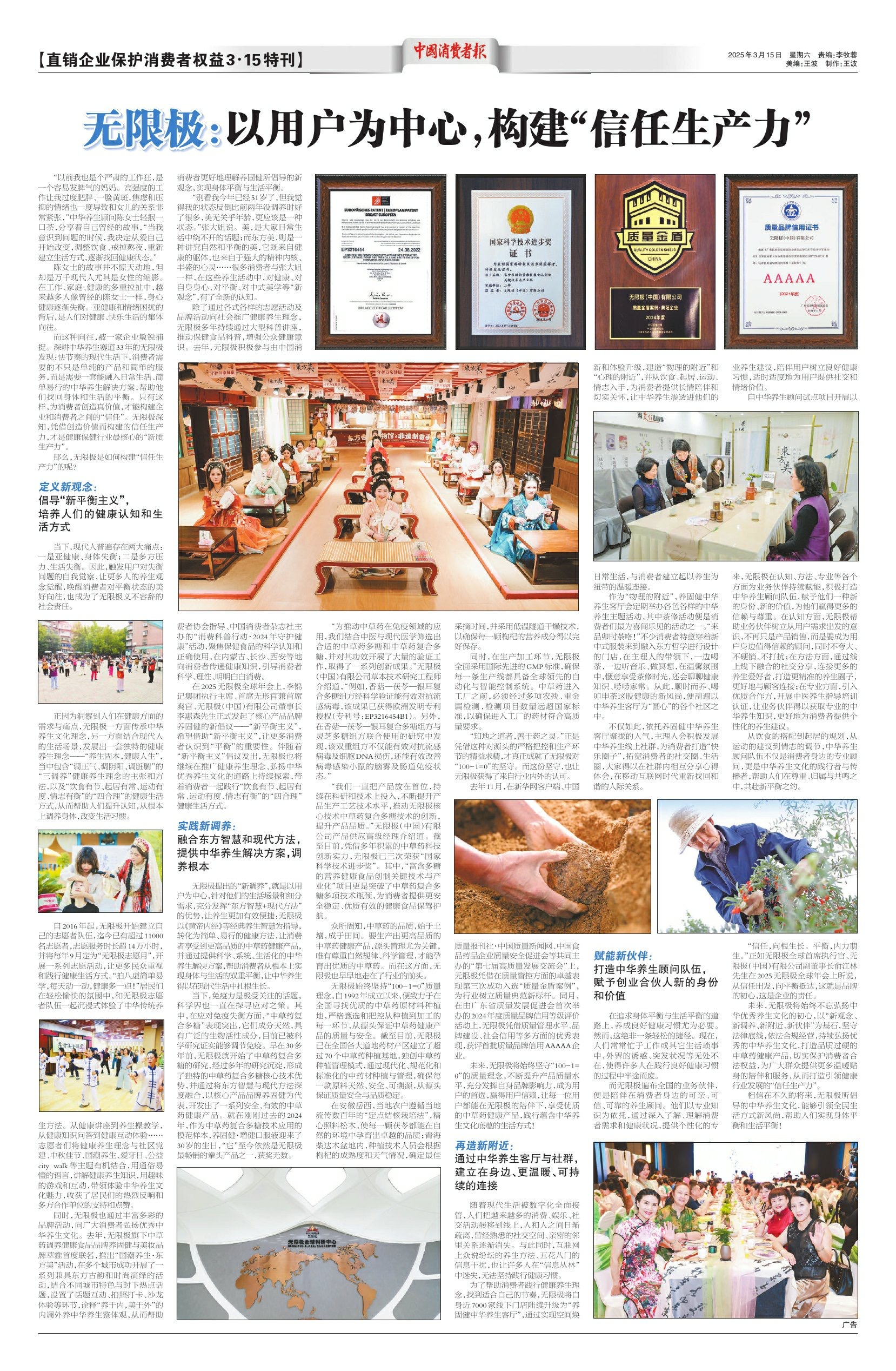 3月15日,中国消费者报推出了2025年度《直销企业保护消费者权益3·15特刊》,向广大消费者介绍直销企业保护消费者合法权益、诚信规范经营的事迹。其中,以《无限极:以用户为中心,构建“信任生产力”》为题,对无限极进行了整版长篇报道。