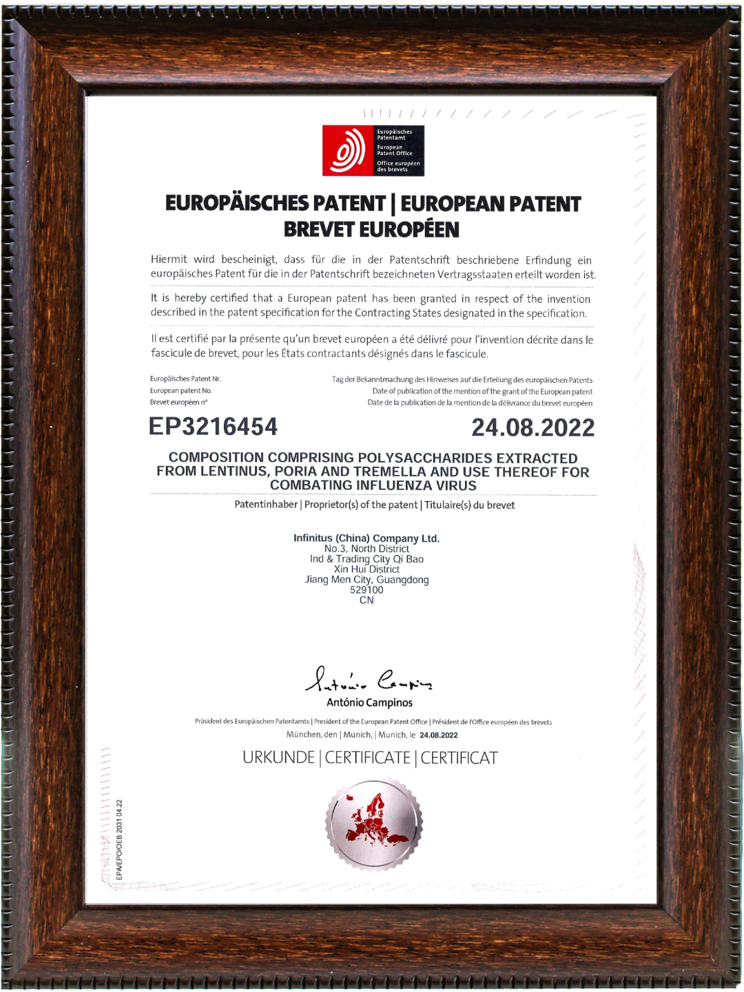 “为推动中草药在免疫领域的应用,我们结合中医与现代医学筛选出合适的中草药多糖和中草药复合多糖,并对其功效开展了大量的验证工作,取得了一系列创新成果。”无限极(中国)有限公司草本技术研究工程师介绍道,“例如,香菇—茯苓—银耳复合多糖组方经科学验证能有效对抗流感病毒,该成果已获得欧洲发明专利授权(专利号:EP3216454B1)。另外,在香菇—茯苓—银耳复合多糖组方与灵芝多糖组方联合使用的研究中发现,该双重组方不仅能有效对抗流感病毒及细胞DNA损伤,还能有效改善病毒感染小鼠的脑雾及肠道免疫状态。”
