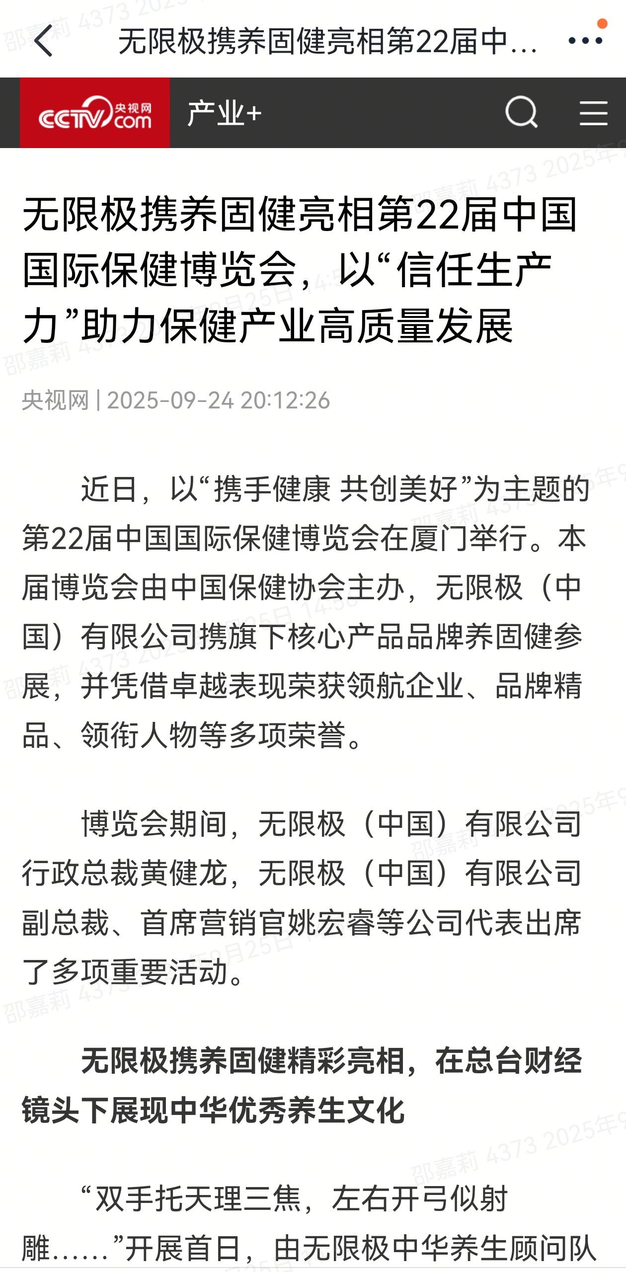 近日,以"携手健康 共创美好"为主题的第22届中国国际保健博览会在厦门圆满落幕。无限极携旗下品牌养固健精彩亮相,一举斩获领航企业、品牌精品、领衔人物等多项荣誉。央视网对本次盛会进行了全程报道,以下为报道原文: